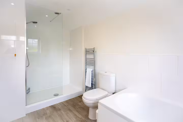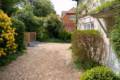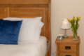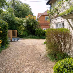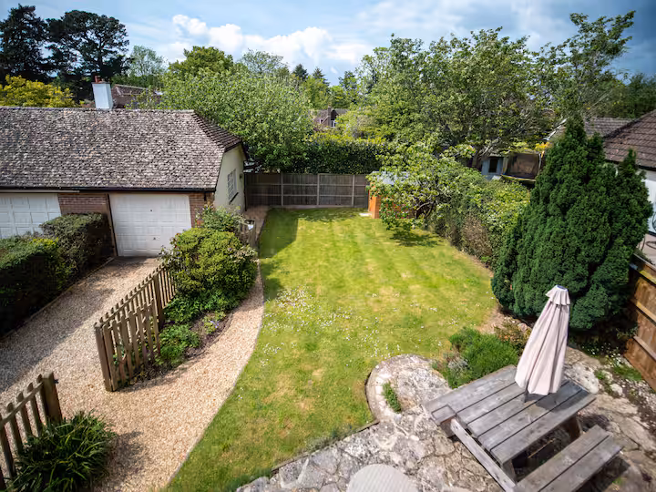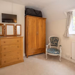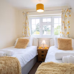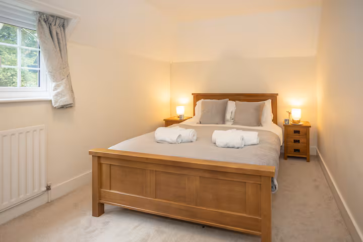 The third bedroom, which overlooks the quaint back garden, is smaller but equally charming, with twin beds (which can be converted into a super-king) and fitted wardrobes. The modern family bathroom, located across the landing, is bright and clean, with a bathtub, walk-in shower, and luxury linens provided for all guests.