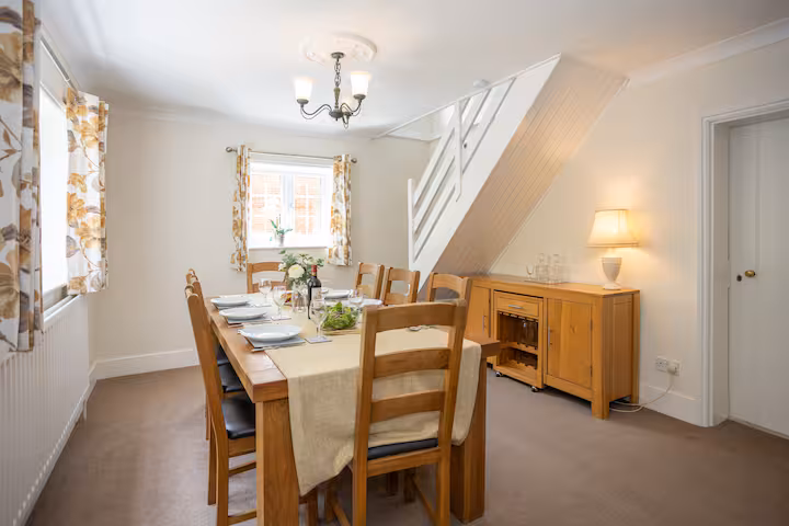 A private gravel drive with mature hedges and flowering plants welcomes you to this charming property. Upon entering the front door, you’re greeted by a spacious dining room featuring an oak table and seating for eight. This opens into a well-equipped country kitchen, where a complimentary welcome hamper awaits, complete with local cider, jam, biscuits, and more to give you a taste of the New Forest. The kitchen is fully stocked with all the essentials, including an electric oven and hob, fridge/freezer, bread maker, food mixer, dishwasher, microwave, and washer/dryer. There’s also a breakfast table that seats six, offering a lovely view of the garden.