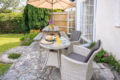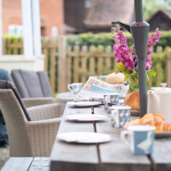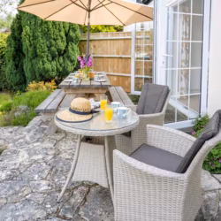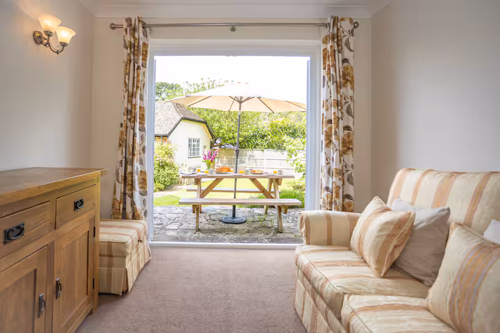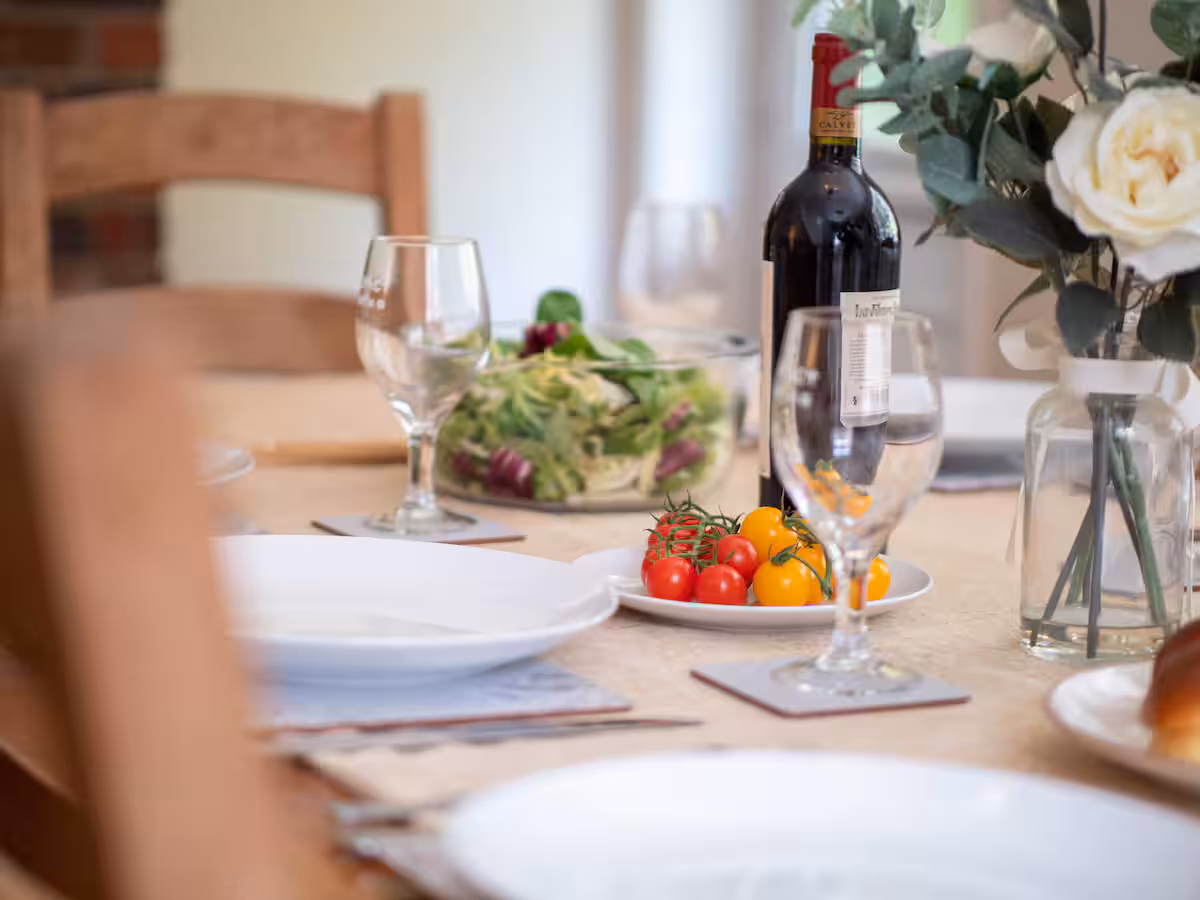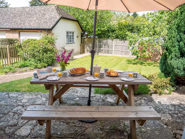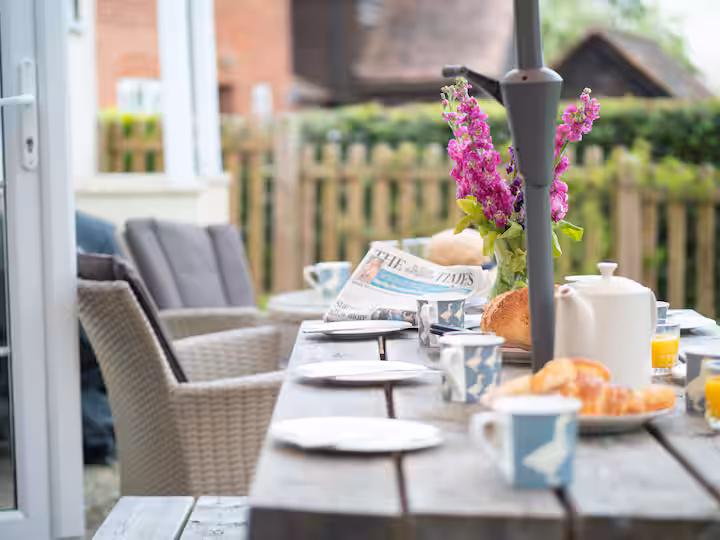 The spacious lounge is a cozy retreat, offering comfy sofas where you can unwind in front of the 50” Smart TV, which includes Disney+, Netflix, and Amazon Prime (guests should provide their own logins). Alternatively, enjoy a good book by the French windows, which overlook the pretty country garden. The outdoor patio area is ideal for enjoying a barbecue or soaking up the sunshine after a day of exploring the forest or nearby beaches.