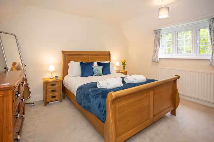 The master bedroom is located immediately to the right and features a king-size bed, Smart TV, and a bedroom chair for relaxing. A travel cot is available upon request. Next door, the second king-size bedroom also has a TV, full-length mirror, and views of the forest. Both of these rooms feature double oak wardrobes and chests of drawers, offering plenty of storage.