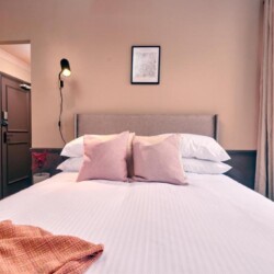 Our largest and most luxurious offering, this Deluxe King Room features a King-size bed, generous floor space, and a stylish private bathroom with a walk-in shower and complimentary toiletries. Perfect for couples or guests who appreciate extra space, the room includes: